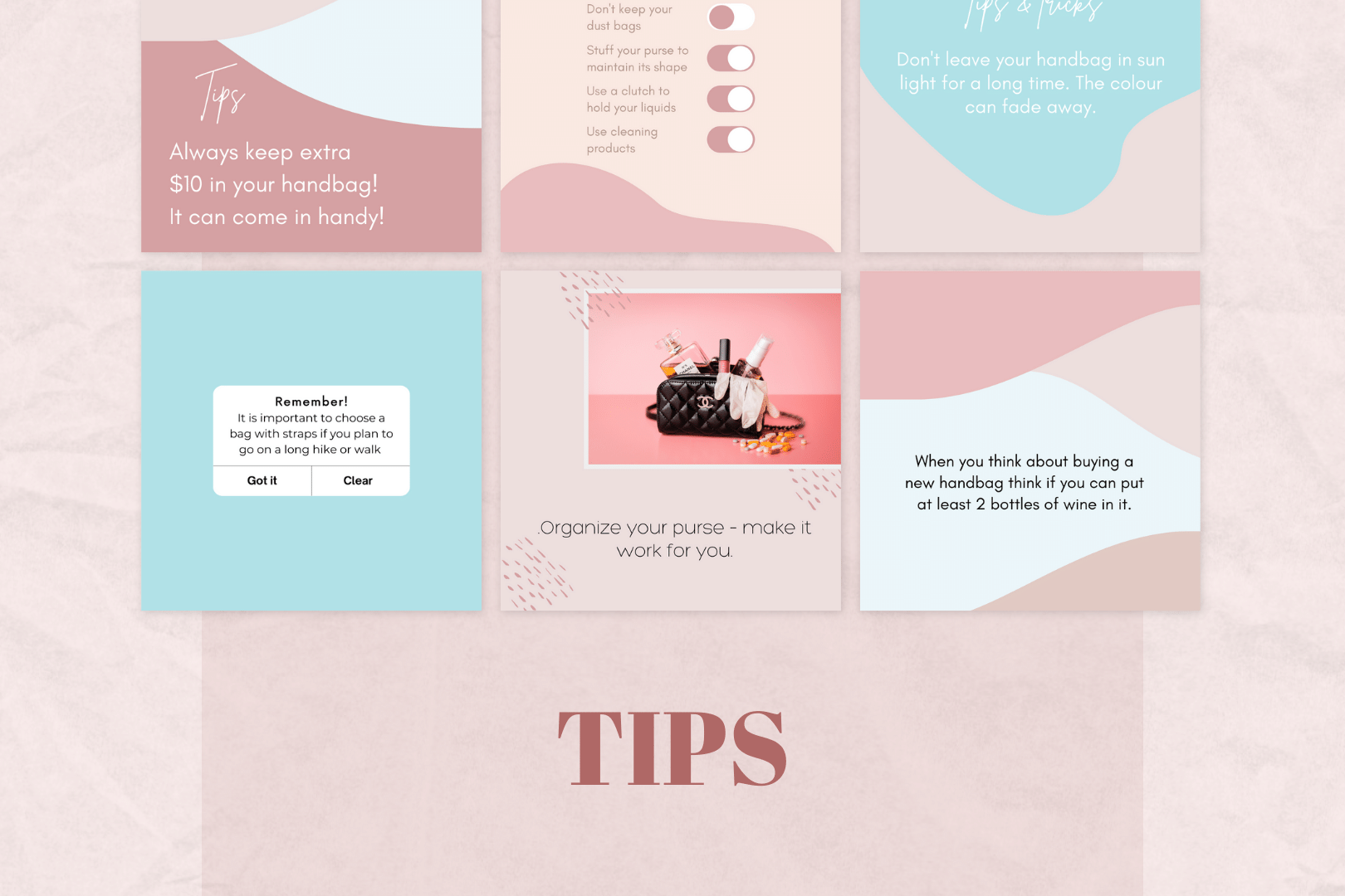Speciaal ontworpen voor tassenwinkels, designers, influencers en ondernemers die hun handtassenmerk stijlvol willen promoten op social media.