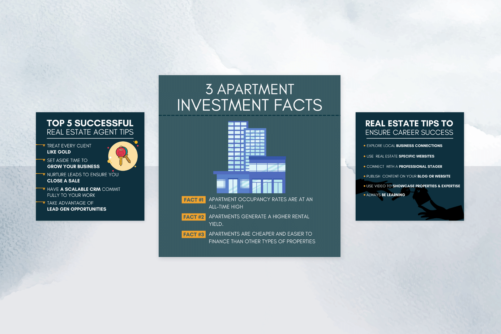 Dit pakket verandert jouw vastgoedbedrijf volledig. Met een sterke aanwezigheid op social media verkoop je appartementen twee tot vijf keer zo veel én twee keer zo snel. Met deze vastgoedinfographics positioneer je jezelf als een topexpert in de vastgoed- en woningmarkt.