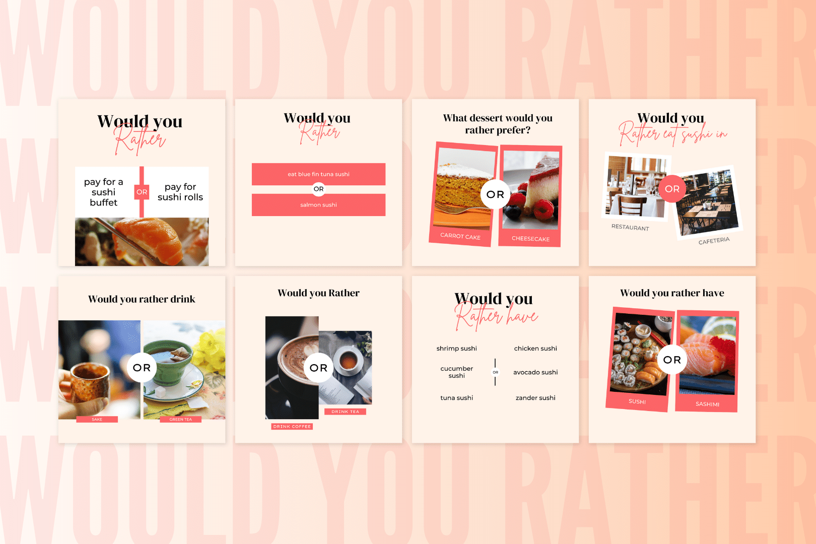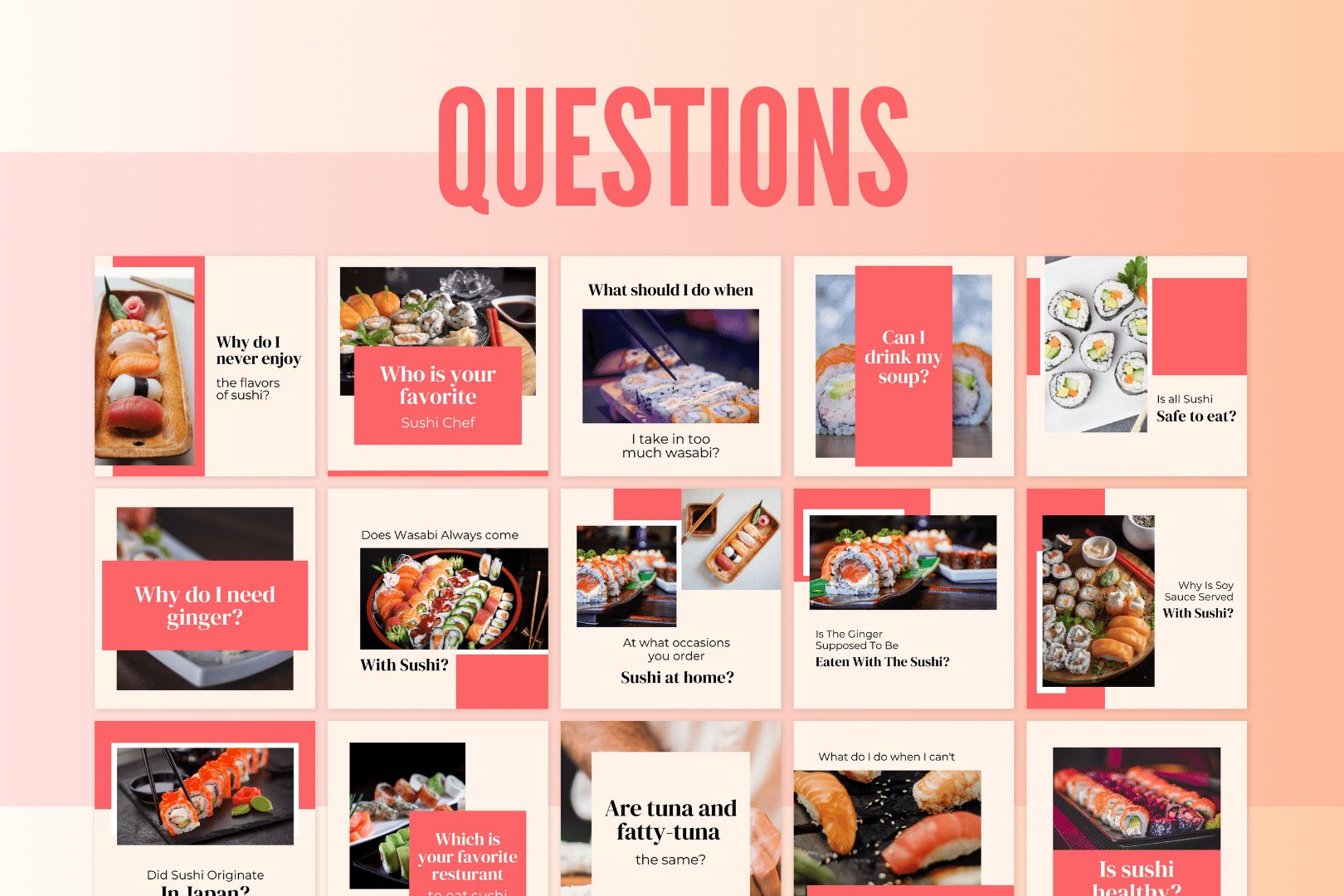 Ontvang 300 kant en klare sushi templates voor sushi restaurants. Ideaal als je je zichtbaarheid wilt vergroten en meer volgers, betrokkenheid en bestellingen wilt aantrekken. Met deze bundel zet je in een paar tellen smakelijke, opvallende en professionele content online die klanten direct zin geeft in sushi.