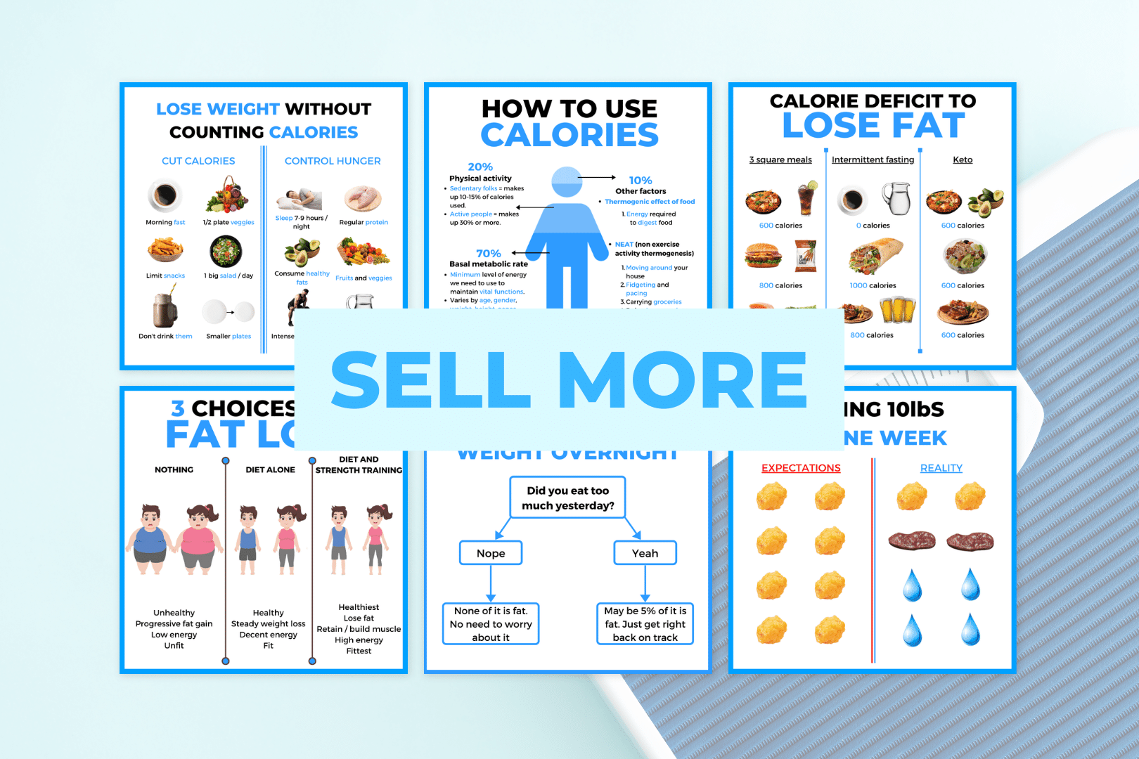 Ontvang 50 kant en klare weight loss infographics voor je social media. Perfect wanneer je jezelf wilt positioneren als een deskundige die duidelijkheid, structuur en motivatie biedt. Deze infographics helpen je om complexe informatie simpel uit te leggen en jouw volgers op een visuele manier te inspireren om gezondere keuzes te maken.